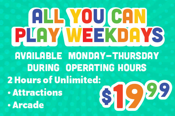 Make the most of your weekdays with our All You Can Play Weekdays special! Available Monday–Thursday during operating hours, this limited-time offer gives you 2 hours of unlimited attractions and arcade play for just $19.99 per person.